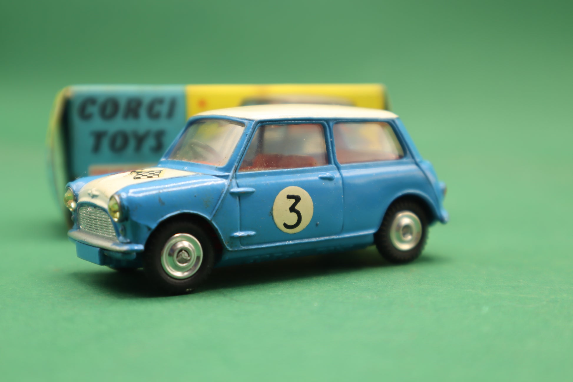 corgi toys - 227- morris mini cooper competition model. original box. available in blue and white with red interior. gray steering wheel, clean base plate, well treaded tyres, superb silver trim. very good condition. condition as per photo