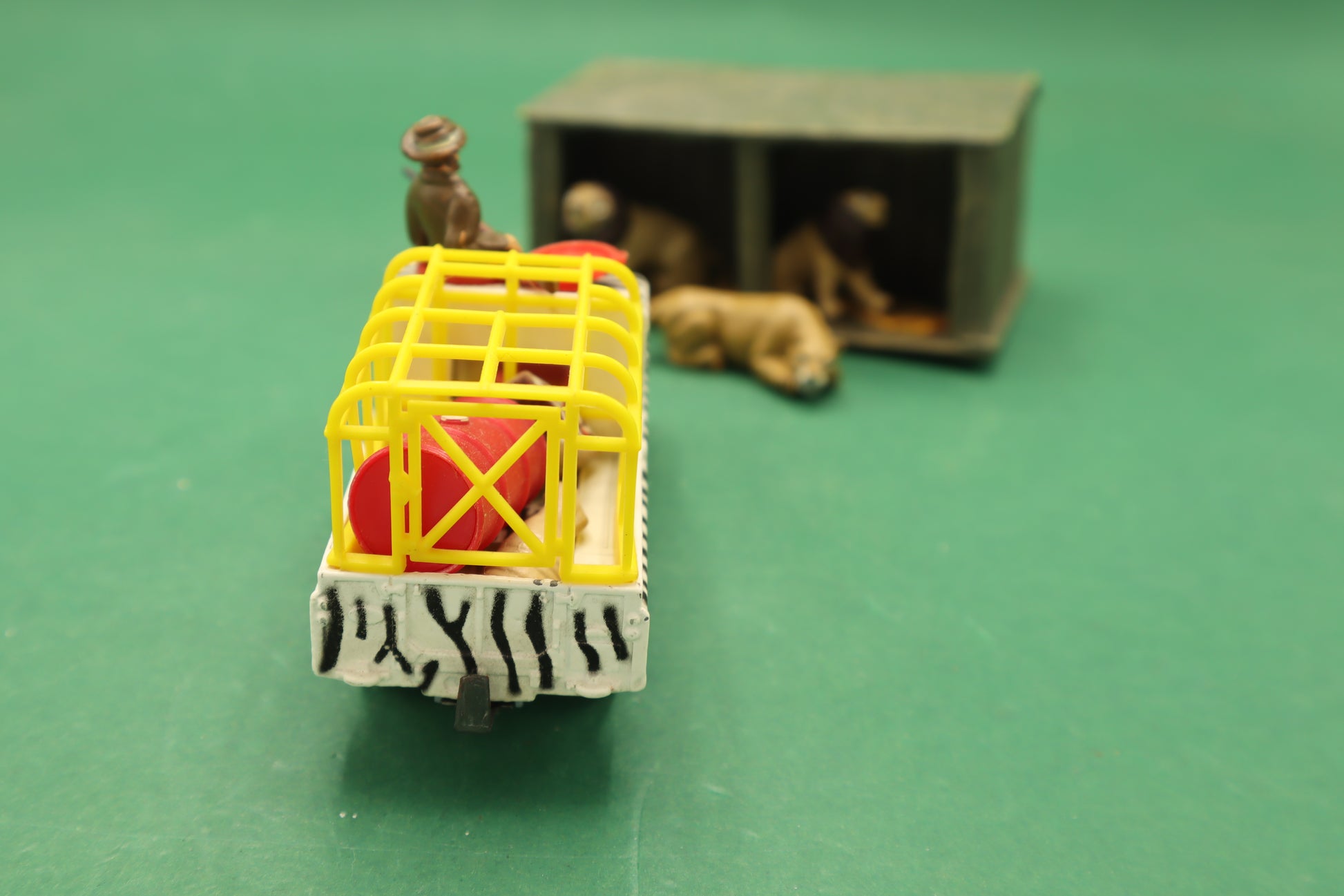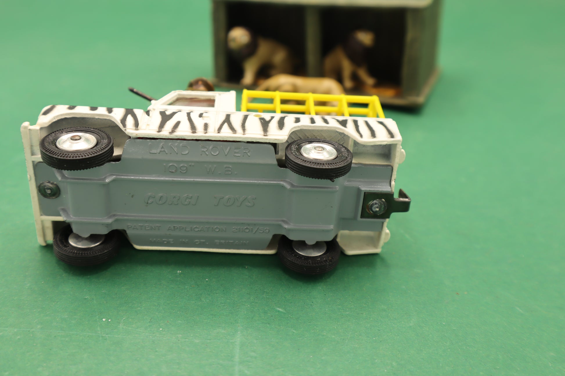 Corgi Toys Land Rover 109 Pickup Truck Lions of Longleat Zebra Stripe with enclosure box and accessories. MECCANO ENGLAND.